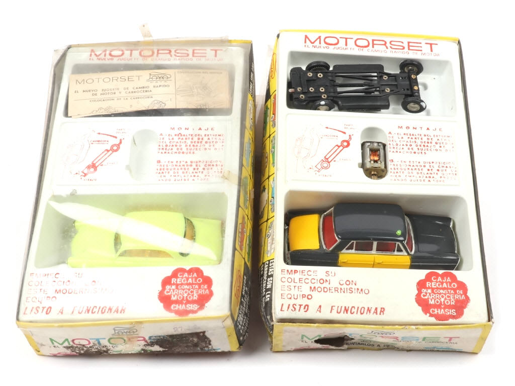 dimensions des coffrets : 27 x 16 cm - longueur des voitures 13 cm - réalisation en plastique - moteur non testé - avec notices - comprend : SEAT TAXI Barcelone & SIMCA MONACO - ensemble encrassé - modèles avec quelques petites craquelures à l'intérieur des carrosseries - certains pneus collés avec le support - boites avec importante humidité