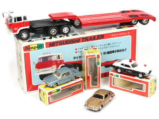 miniatures reproduisant les modèles : MITSUBISHI (échelle 1/35ème, fixation de cabine remplacée avec quelques retouches), PORSCHE & NISSAN (2 exemplaires différents dont un avec une partie de pellicule chromée altérée) - un blister de boîte déchiré