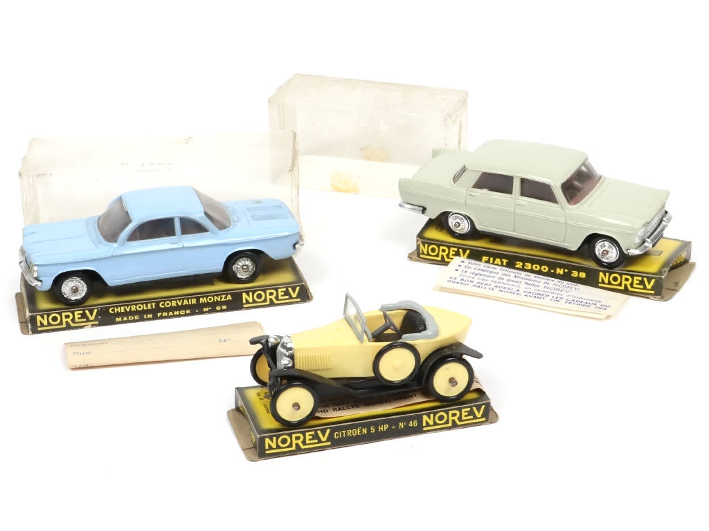 comprend : CITROEN 5 HP, FIAT 2300 & CHEVROLET CORVAIR MONZA (jantes légèrement fondues - carrosserie tachée à un endroit) - quelques légers manques de pellicule chromée - boites en état 'c'