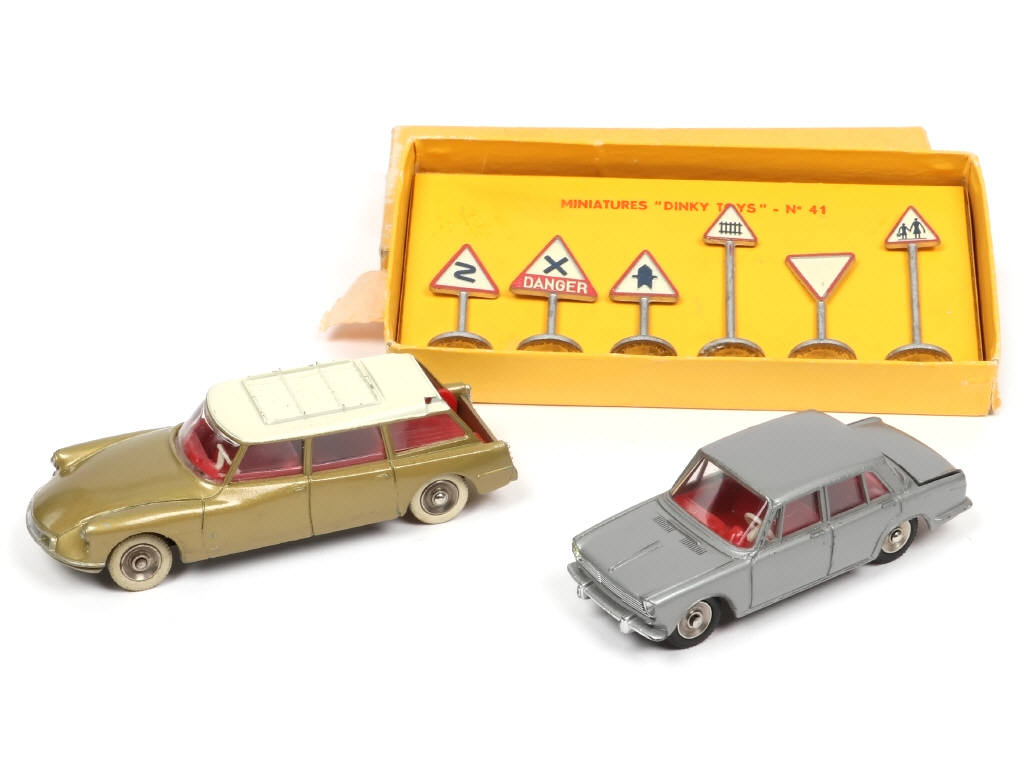 comprend : CITROEN ID19 break (manque hayon), SIMCA 1500 (manque un phare diamant) & panneaux de signalisation ROUTE (boite en état 'c') - pneus séchés