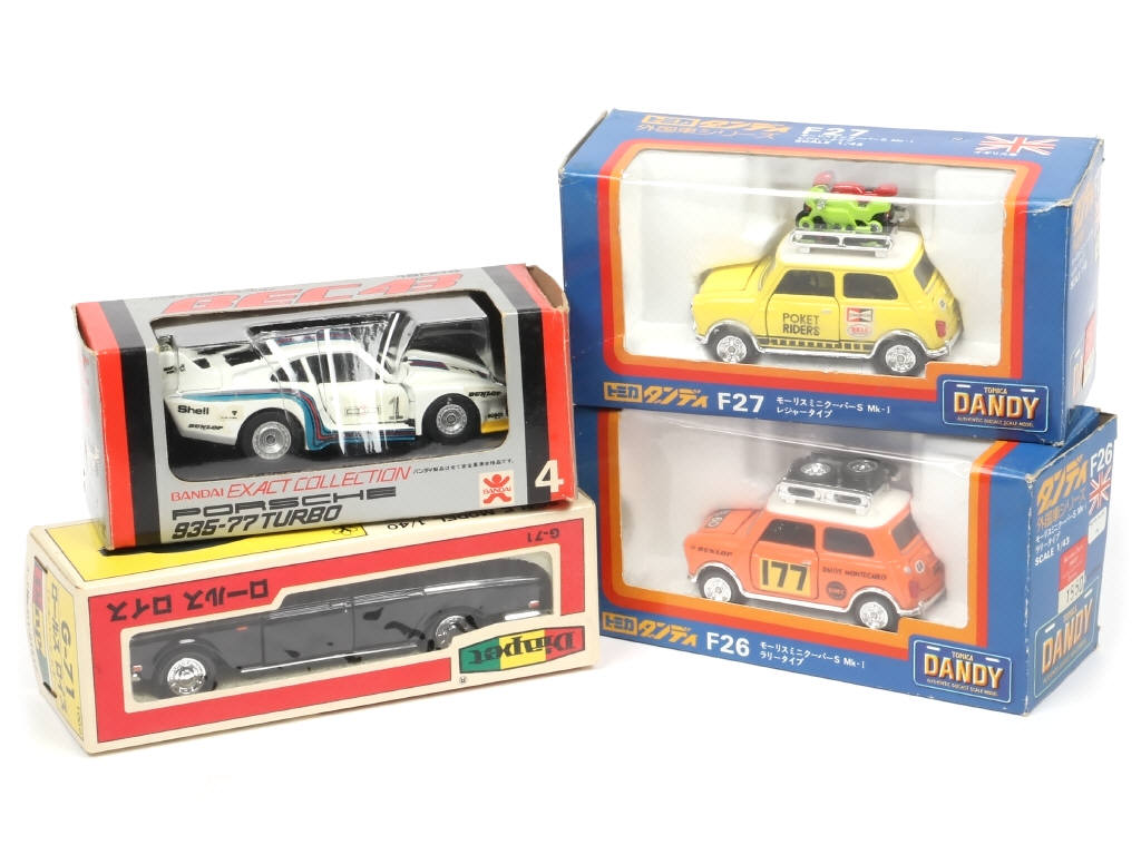 miniatures reproduisant les modèles : PORSCHE, ROLLS ROYCE & MINI COOPER - on y retrouve les marques : TOMICA DANDY, BANDAI & YONEZAWA - 2 boites en état 'c' (avec ruban adhésif)