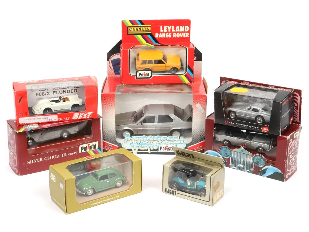 miniatures reproduisant notamment les modèles : MERCEDES, PORSCHE & ROLLS ROYCE - on y retrouve les marques : POLISTIL, RIO, OLDCARS, BRUUM & BEST MODEL - quelques boites en état 'c' & certaines avec ruban adhésif