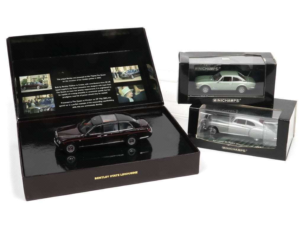 comprend : BENTLEY STATE limousine, R-TYPE CONTINENTAL 1955 & PEUGEOT 504 coupé - un modèle en série limitée - un couvercle de boite avec une fêlure
