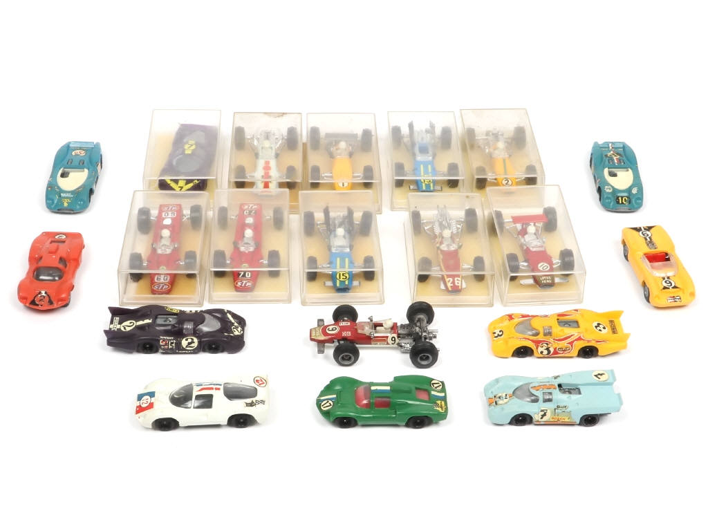 fabrication métal & plastique - certains modèles plus ou moins encrassés - comprend notamment les modèles : PORSCHE, FERRARI & CHAPARRAL - possibilité de petits manques (notamment sur les décalques) & parties cassées - 10 modèles en boites (état 'b' & 'c')
