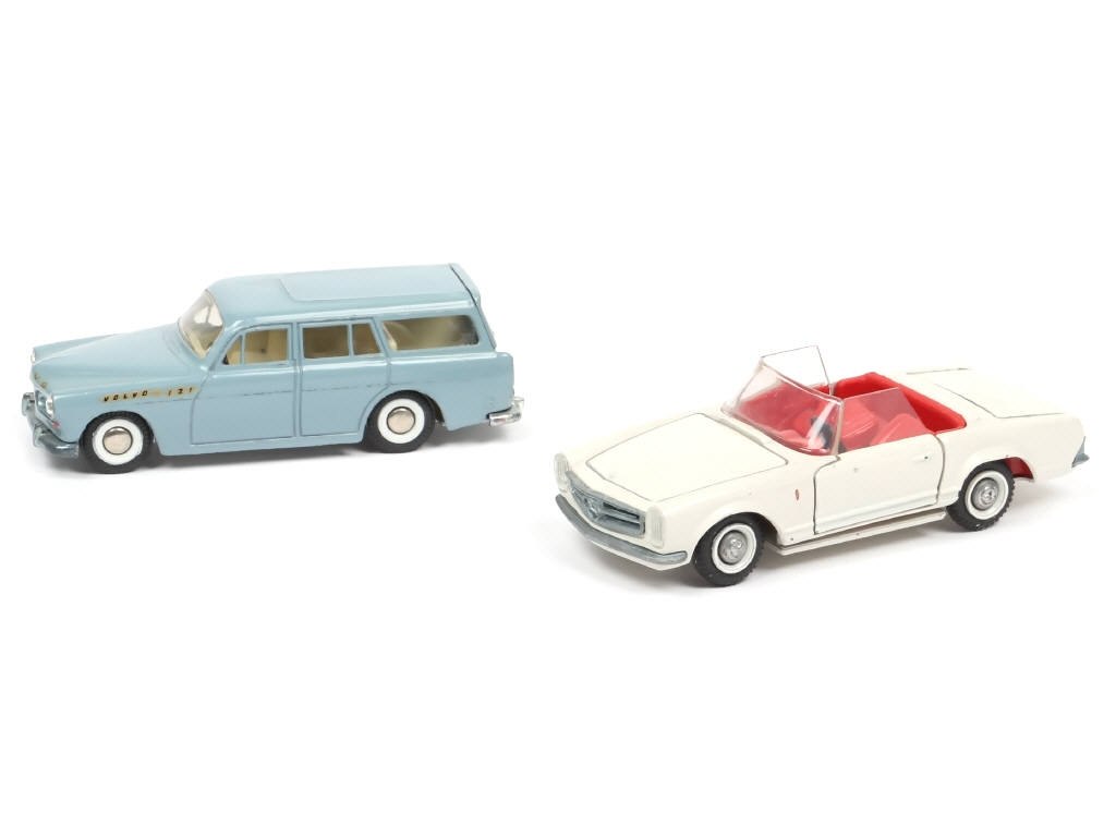 comprend : VOLVO AMAZON 121 Break 1963-1965 (VOLVO 221 inscrit sur le plancher) & MERCEDES-BENZ 230 SL cabriolet (carrosserie cintrée) - avec parties ternies & pneus séchés