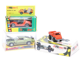 comprend : HONDA N 360, FORD MUSTANG BOSS, LOTUS F1 & camion-plateau - boites en état 'b' dont une avec fêlure (un modèle sans)
