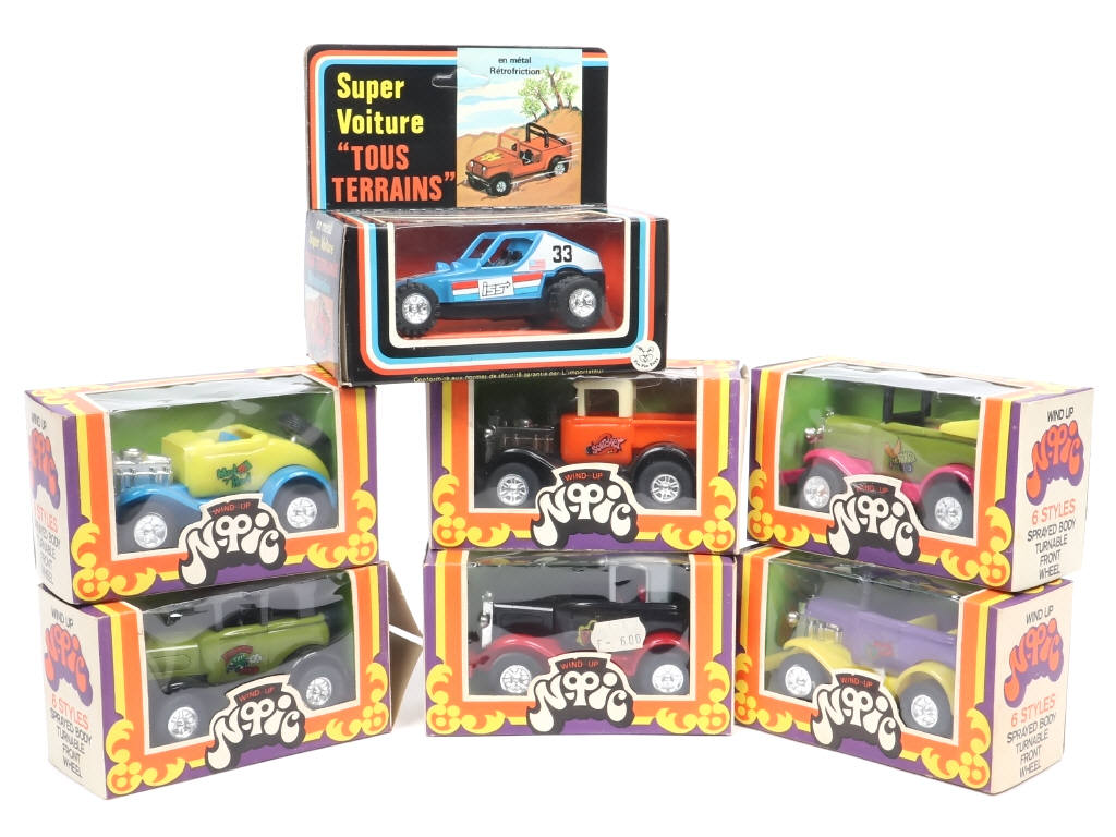 6 moteurs à ressort & un à rétro-friction - quelques boites avec accrocs dont certaines avec blister déchiré