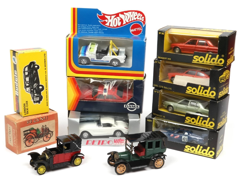 comprend notamment les modèles : tAXI DE LA MARNE, BENZ limousine, RENAULT 18 & PEUGEOT 305 - on y retrouve les marques : SOLIDO, BUDGIE MODELS, GAMA, ZISS MODEL, VITESSE MATTEL & J.M.K - éléments manquants sur 2 exemplaires - boites en états 'b' & 'c' (2 modèles sans)
