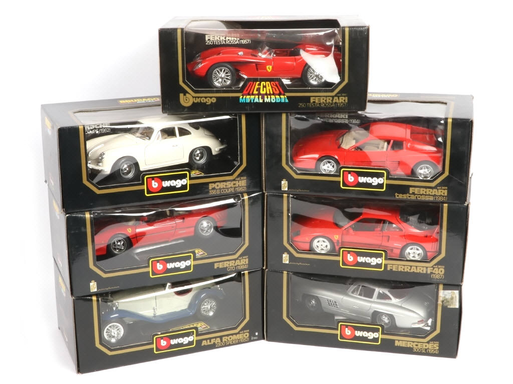 échelle 1/18e - comprend les modèles : FERRARI, PORSCHE, ALFA ROMEO & MERCEDES - boîtes en état 'b' avec blisters plus ou moins déformés - possibilité de manques & parties cassées
