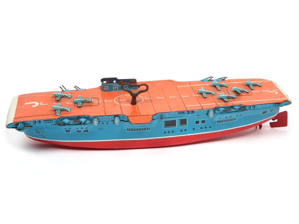 SAN - MARUSAN TOYS (JAPON) Porte-avions en tôle liyhographiée bleu, rouge & orange