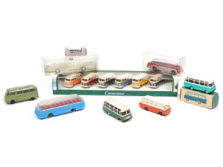 petites échelles - comprend notamment les modèles : SETRA, VOLKSWAGEN & MERCEDES - on y retrouve notamment les marques : I.M.U, VIKING, MATCHBOX & CARARAMA - un modèle avec une roue manquante - 3 modèles en boites 'b' & 'c'