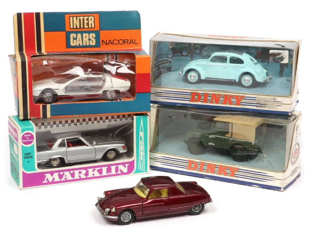 comprend les modèles : CITROEN, VOLKSWAGEN, LAND ROVER, MERCEDES & LAMBORGHINI (sièges à repositionner & un manquant) - on y retrouve les marques : MÄRKLIN, NACORAL, DINKY MATCHBOX & CORGI TOYS - boites en états 'b' & 'c'