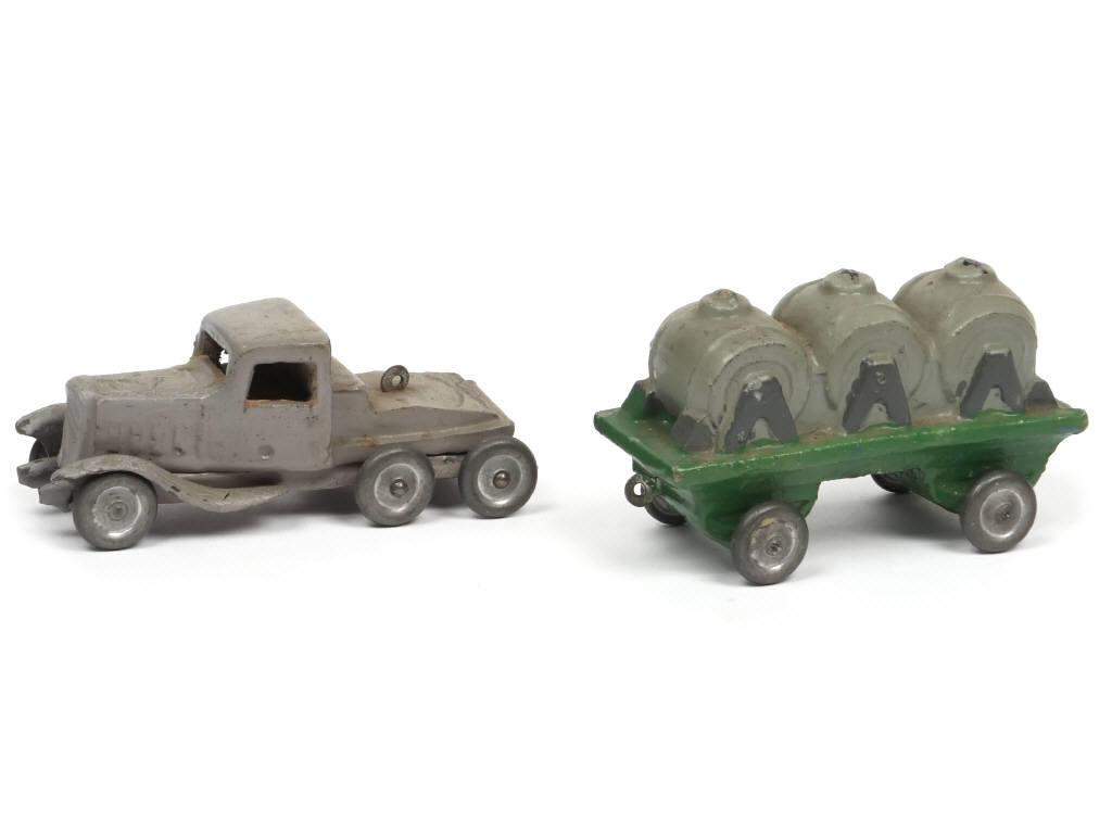réalisation en plâtre & farine avec châssis en tôle (JOUETS CITROËN - déformations sur les fixations d'essieux arrières) & roues métal - longueur : 18,5 cm - manque chenilles - peinture craquelée sur le tracteur - manque crochet d'attelage