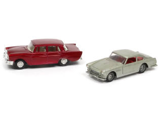 comprend : FERRARI 250 GT 2+2 (traces d'humidité par endroits) & MERCEDES 220 SE (sigle de calandre manquant - quelques petits manques sur les décalques de feux arrières) - on y retrouve les marques : BUBY & SOLIDO