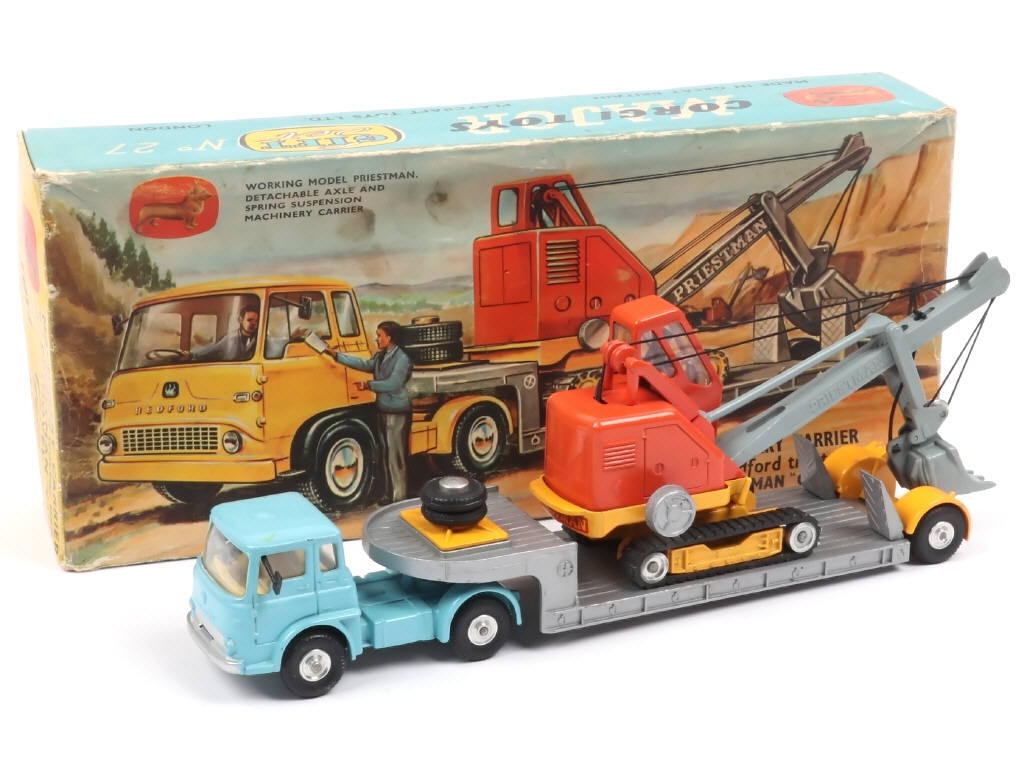 CORGI TOYS (GB) GS27 BEDFORD TK Semi-remorque plateau surbaissé avec pelleteuse PRIESTMAN bleu ciel, gris métal, jaune d'or & orange