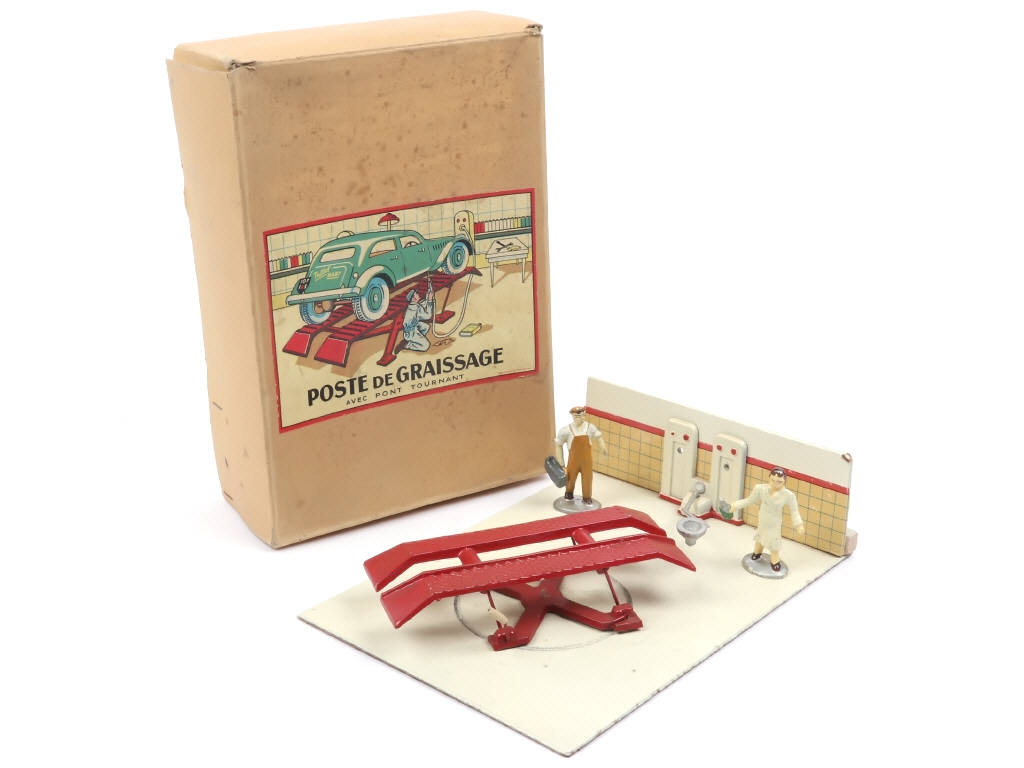 dimensions : 16 X 22 cm - sans véhicule - ensemble plus ou moins encrassé (taches sur la boîte, légèrement déformée) - manque cloche - tuyaux de pompe (séchés & jaunis, un exemplaire incomplet, manque fixations) & un pistolet présents - un petit enfoncement sur une extrémité de panneau vertical - frottements autour du pont - on y joint 2 figurines