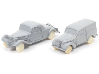 comprend : RENAULT DAUPHINOISE (un pare-chocs arrière cassé & manquant) & CITROËN TRACTION faux cabriolet (pare-chocs avant manquant) - exemplaires de présérie réalisés en résine représentant les futurs modèles destinés à la commercialisation - échelle 1/43ème