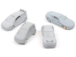 comprend : CITROËN C4, PEUGEOT 205, FIAT PANDA 4x4 & ASTON MARTIN - exemplaires de présérie réalisés en résine & plastique représentant les futurs modèles destinés à la commercialisation - échelle 1/43ème - quelques accessoires manquants