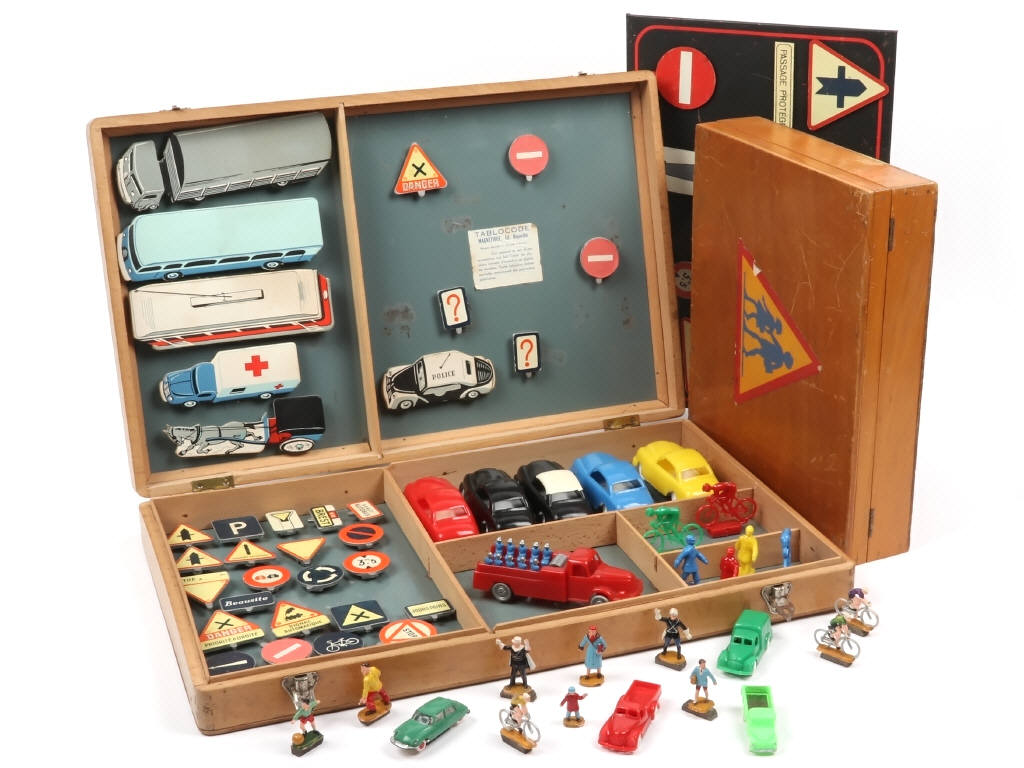 dimensions du coffret : 43,5 x 28 cm (état 'b') - réalisations en plastique, carton & métal - contient : 12 véhicules, 6 figurines & 30 panneaux - tous les éléments sont munis d'un aimant permettant la reproduction des différents incidents de la circulation routière - on y joint un présentoir magnétique avec 10 panneaux de la marque 'GRE' (état 'C') & un autre coffret de la marque DOURY contenant 10 figurines & 4 véhicules - quelques petits éléments cassés, manquants & non d'origine