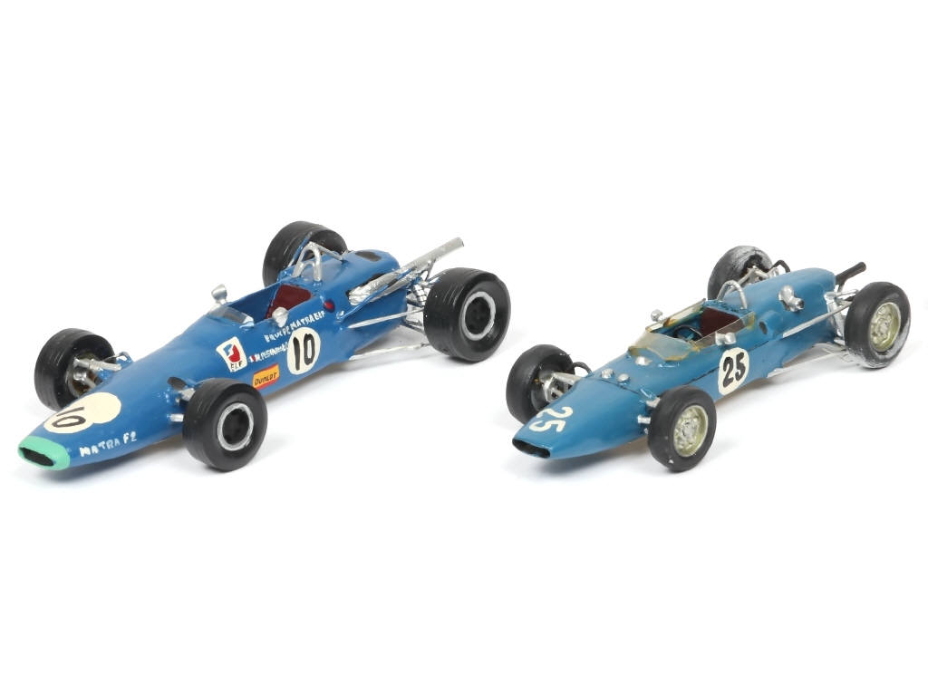 création artisanale en bois - comprend : MATRA-FORD 1600 FII 1968 (réalisation de 1969, manque aileron arrière) & MATRA-COSWORTH FIII 1965 (réalisation de 1965)