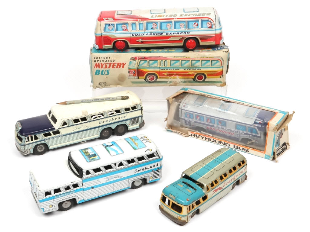 longueur du plus grand : 29 cm - 2 modèles avec moteurs à piles (non testré) & 3 à friction (fonctionnent) - on y notamment retrouve les marques : DAITO, KATO SAIREN, TATSUYA & NISHIMURA - oxydation par endroits - possibilité de petits manques - 2 modèles en boites états 'd' & 'e'