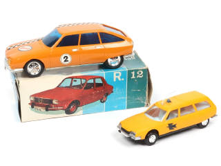 échelle 1/24ème - moteur à friction (fonctionne) - un autocollant de portière légèrement déchiré - on y joint une CITROEN CX break de la marque INJECTAPLASTIC