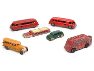 on y retrouve notamment les marques : SOLIDO (dont un modèle avec moteur - fonctionne), TOOTSIE TOY (une partie cassée & manquante à l'arrière du toit) & BARCLAY - pneus plus ou moins endommagés