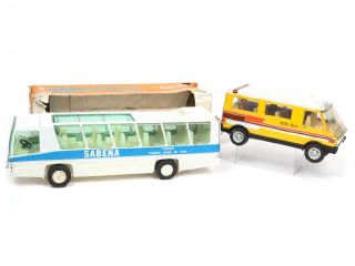 avec moteurs à friction (fonctionnent dont un poussivement) - longueur du plus grand : 38 cm - comprend : autocar panoramique 'SABENA' (boite en état 'd') & minibus (avec certains sièges endommagés - manque hayon) - carrosseries plus ou moins encrassées - quelques points d'oxydation