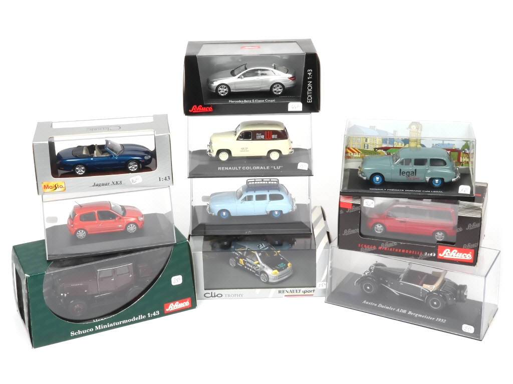 miniatures reproduisant notamment les modèles : JAGUAR, RENAULT & DAIMLER - on y retrouve notamment les marques : MAISTO, SCHUCO & ELIGOR - quelques accrocs sur les suremballages (certains manquants)