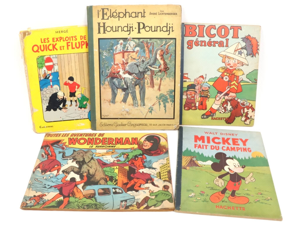 comprend : TOUTES LES AVENTURE DE WONDERMAN (bon état - rare exemplaire de 1950 au format à l'italienne par DUPUICH), MICKEY FAIT DU CAMPING (assez bon état - Rééd 1949), BICOT GENERAL (bon état - EO 1938), L'ELEPHANT HOUNDJI POUNDJI (état moyen - EO 1928 aux éditions GAUTIER LANGUEREAU) & LES EXPLOITS DE QUICK ET FLUPKE (mauvais état - Rééd 6e série)