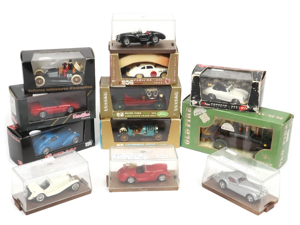 comprend notamment les modèles : PORSCHE, FERRARI, FORD, ALFA ROMEO, JAGUAR & CHEVROLET - on y retrouve les marques : BRUMM & DETAILCARS - quelques petits manques de pellicule chromée - boites en état 'b' & 'c' dont certaines avec frottements