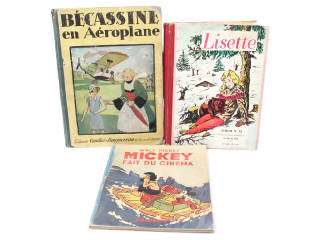 comprend : MICKEY FAIT DU CINEMA (édition de 1941 - dos bleu toilé avec manques - bon état général malgré quelques traces d'usures), LISETTE ALBUM N°32 (recueil de 1956 - état moyen, déchirures) & BECASSINE EN AEROPLANE (EO de 1930 - mauvais état)