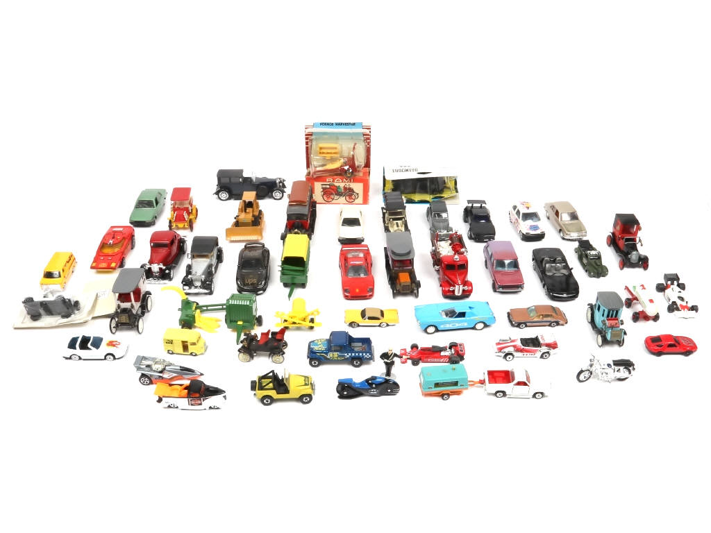 comprend notamment les modèles : PANHARD, FORD, CITROEN, PEUGEOT & FERRARI - on y retrouve notamment les marques : MINIALUXE, ERTL, NOREV, YATMING, J.M.K, MAJORETTE & SAFIR - quelques manques & parties cassées
