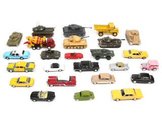 quelques exemplaires avec transformations sur base - comprend notamment les modèles : char CENTURUION, FIAT, DODGE & EUCLID - on y retrouve notamment les marques : C.I.J, CORGI, DINKY TOYS, AUTO PILEN & MERCURY - avec manques, parties cassées et éléments non conformes