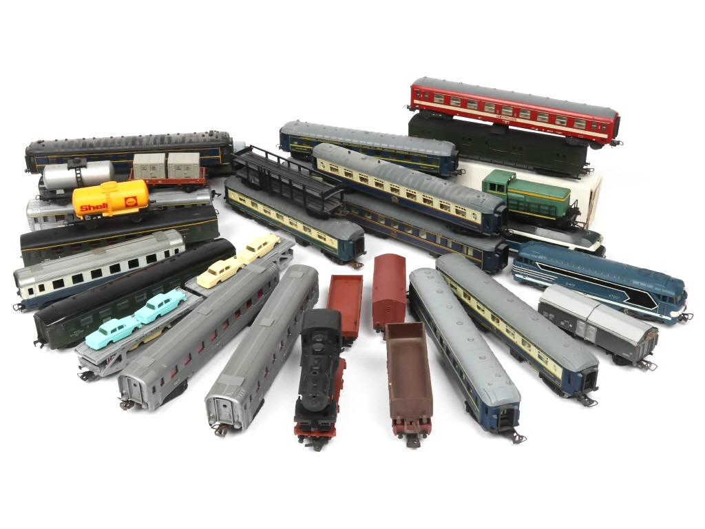 non testé - comprend : motrices, locomotive, voitures de voyageurs & wagons de marchandises - on y retrouve notamment les marques : LIMA, SMCF, HORNBY & JOUEF - avec manques, petites transformations, parties cassées & oxydées (plus ou moins important suivant les modèles)