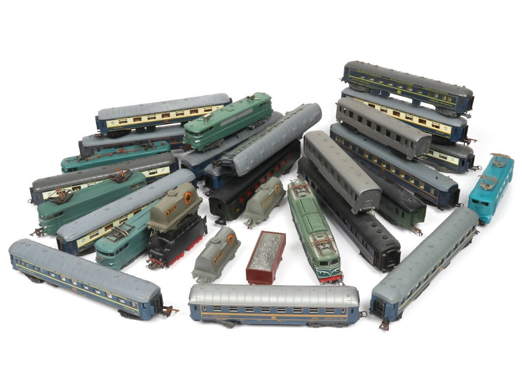 non testé - comprend : motrices, voitures de voyageurs & wagons de marchandises - on y retrouve notamment les marques : LIMA, HORNBY & JOUEF - avec manques, petites transformations, parties cassées, retouchées & oxydées (plus ou moins important suivant les modèles)