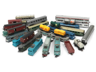 non testé - comprend : motrices, voitures de voyageurs & wagons de marchandises - on y retrouve notamment les marques : POCHER & JOUEF - avec manques, petites transformations, parties cassées, retouchées & oxydées (plus ou moins important suivant les modèles)