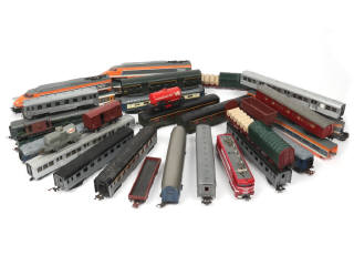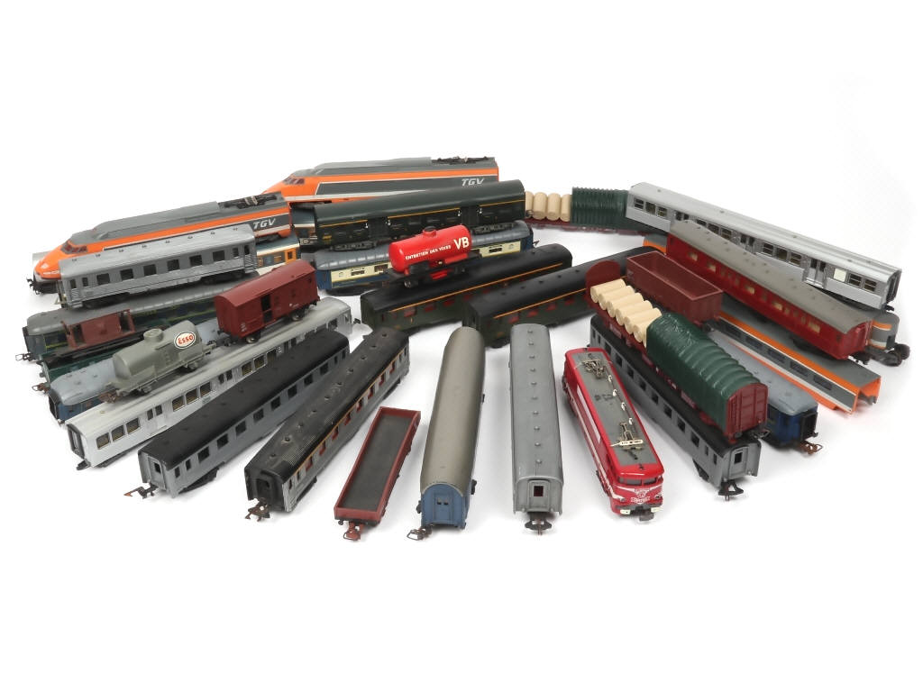 non testé - comprend : motrices, voitures de voyageurs & wagons de marchandises - on y retrouve notamment les marques : LIMA & JOUEF - avec manques, petites transformations, parties cassées, retouchées & oxydées (plus ou moins important suivant les modèles)