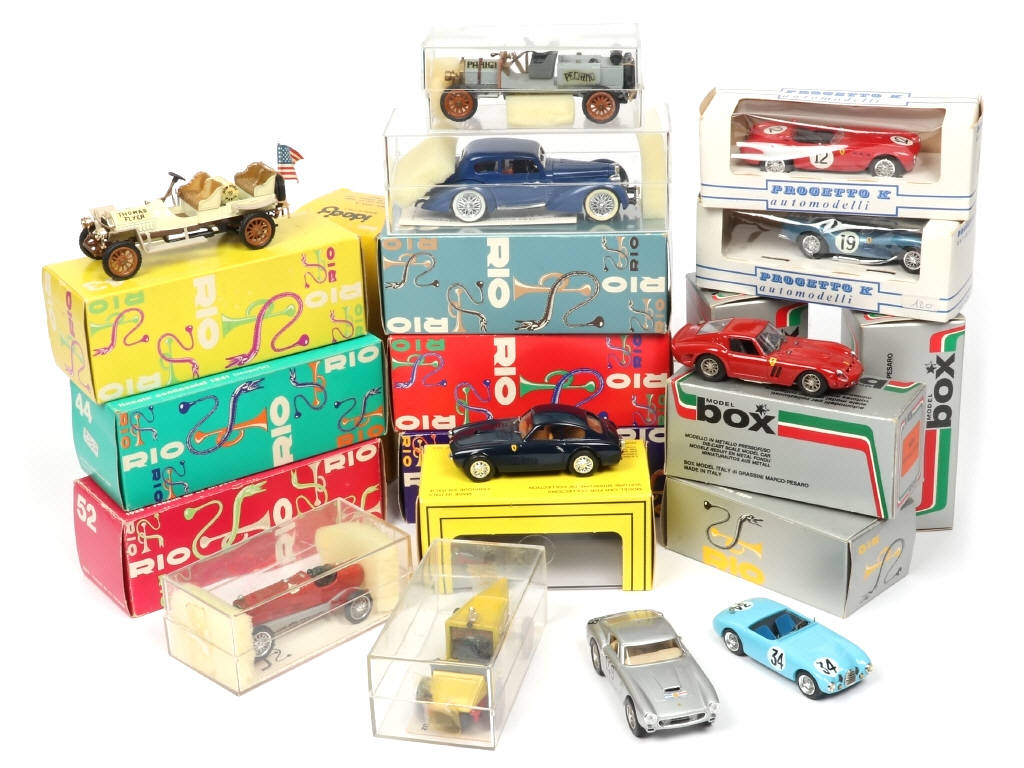 miniatures reproduisant notamment les modèles : FERRARI, DELAHAYE & BUGATTI - on y retrouve notamment les marques : RIO, IDEA 3 & PROGETTO K - quelques petits accessoires cassés & manquants - certaines boîtes incomplètes & certains exemplaires sans boîte