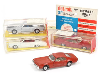 comprend : DODGE CHARGER, CHEVROLET IMPALA, OLDSMOBILE TORONADO - on y joint une PONTIAC FIREBIRD de la marque GAMDA KOOR - boites en état 'b' (manque 3 supports cartonnés & un décollé - étiquettes collées)