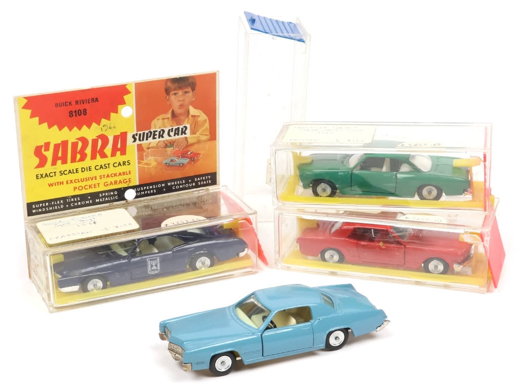 comprend : BUICK RIVIERA, CHEVROLET CORVAIR & FORD MUSTANG - on y joint une CADILLAC ELDORADO de la marque GAMDA KOOR - boites en état 'b' (une cale & 3 supports cartonnés manquants - un décollé - étiquettes collées)