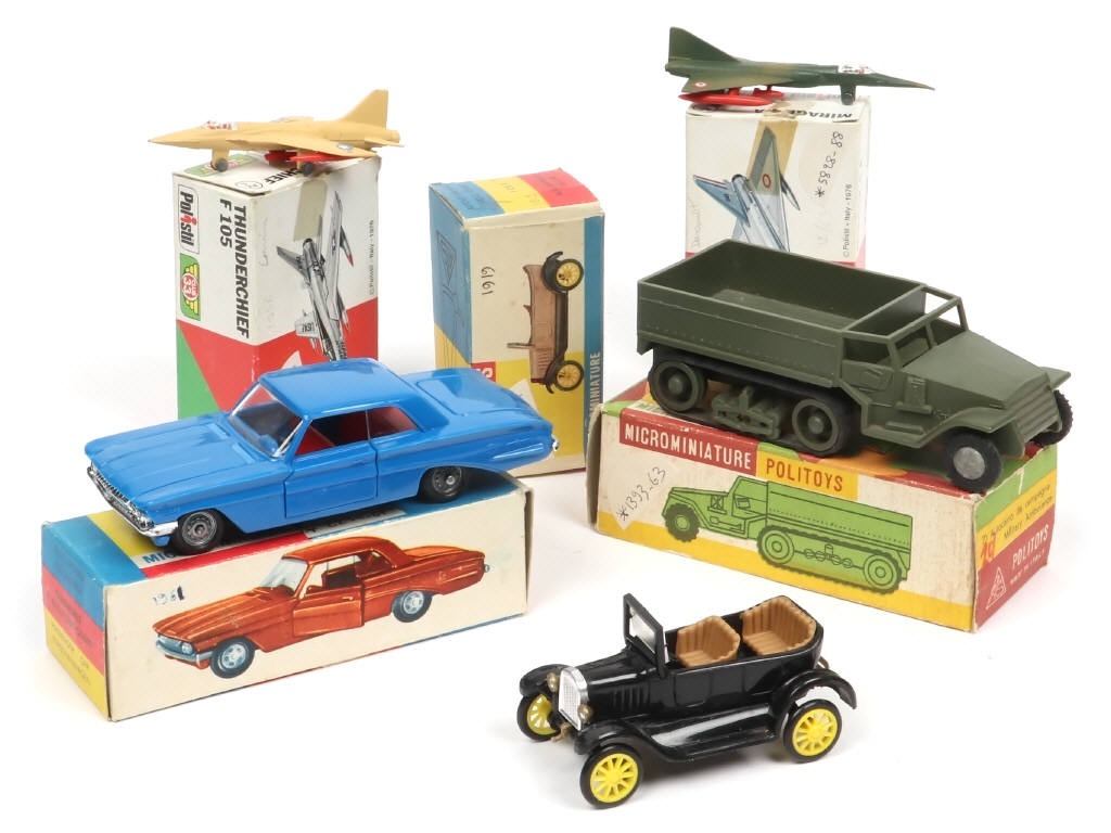 comprend les modèles : OLDSMOBILE, FORD, camion militaire tous terrains, THUNDERCHIEF & MIRAGE - on y retrouve les marques : POLITOYS & POLISTIL - boites en état 'b' avec quelques accrocs, ruban adhésif & étiquettes collées