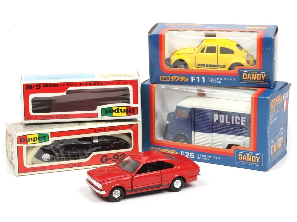 on y retrouve les marques : YONEZAWA TOYS DIAPET (références G-18 & 92 - avec notices) & TOMICA DANDY (références F11 & F25)