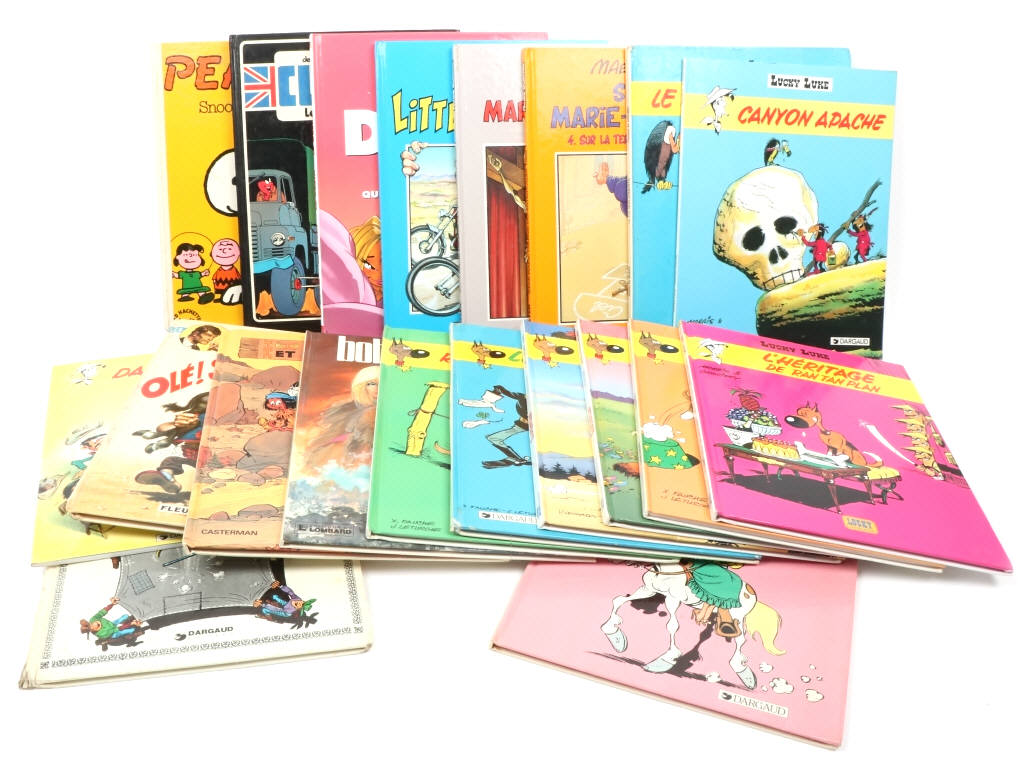 rééditions & quelques EO - comprend notamment : LUCKY LUKE (dont 2 brochés), RANTANPLAN, SOEUR MARIE-THERESE DES BATIGNOLLES (FLUIDE GLACIAL), CLIFTON, BOB MORANE & YAKARI - assez bon à très bon état - frottements, accrocs & traces d'usure