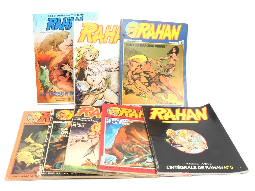 comprend : 6 bimestriels dont les numéros : 1 (pages découpées & incomplètes), 5 (réédition), 18, 23, 25 (très abimé) & 29, un album 'LES GRANDES AVENTURES DE RAHAN (1980) & un recueil des albums 7, 8 & 13 - état moyen à bon état - quelques frottements, déchirures & traces d'usure