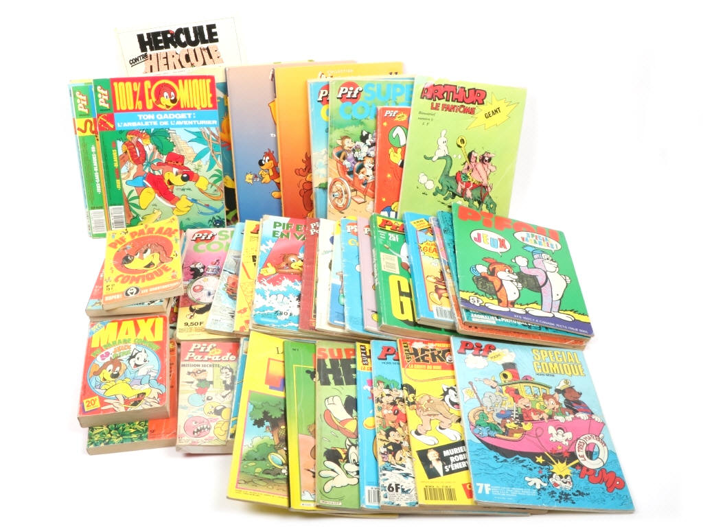 comprend : PIF GADGET, PIF PARADE, PIF SUPER COMIQUE, PIFOU, PIF POCHE, SUPER HERCULE, SUPER P¨LACID & MUZO & ARTHUR LE FANTÔME GEANT - numéros anciens majoritairement - assez bon état à bon état - quelques frottements, déchirures & traces d'usure