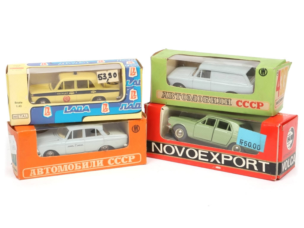 comprend notamment les modèles : LADA & MOSKWICH - un modèle avec petite trace de métal fatiqgue sur une portière - on y retrouve notamment les marques : NOVOEXPORT & ABTOTPACCA - boites en états 'b' & 'c'