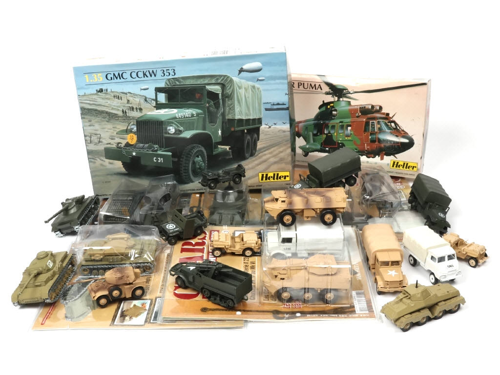 collection 'CHARS & VEHICULES MILITAIRES' - 9 exemplaires sous blisters jamais ouverts (états 'b' & 'c', avec fascicules) - quelques accessoires manquants & petites parties cassées - on y joint 2 maquettes à monter de la marque HELLER (GMC, complète - hélicoptère PUMA, incomplète avec quelques petits éléments cassés)