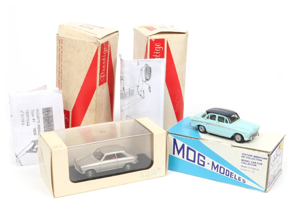 2 kits à monter (semble complet) - comprend : SIMCA P60, PEUGEOT 204 coupé, BUGATTI ROYALE type 41 1926 & 1929 - on y retrouve les marques : AQUAVIT, MOG-MODELES & WESTERN MODELS (boites non conformes en état 'c')
