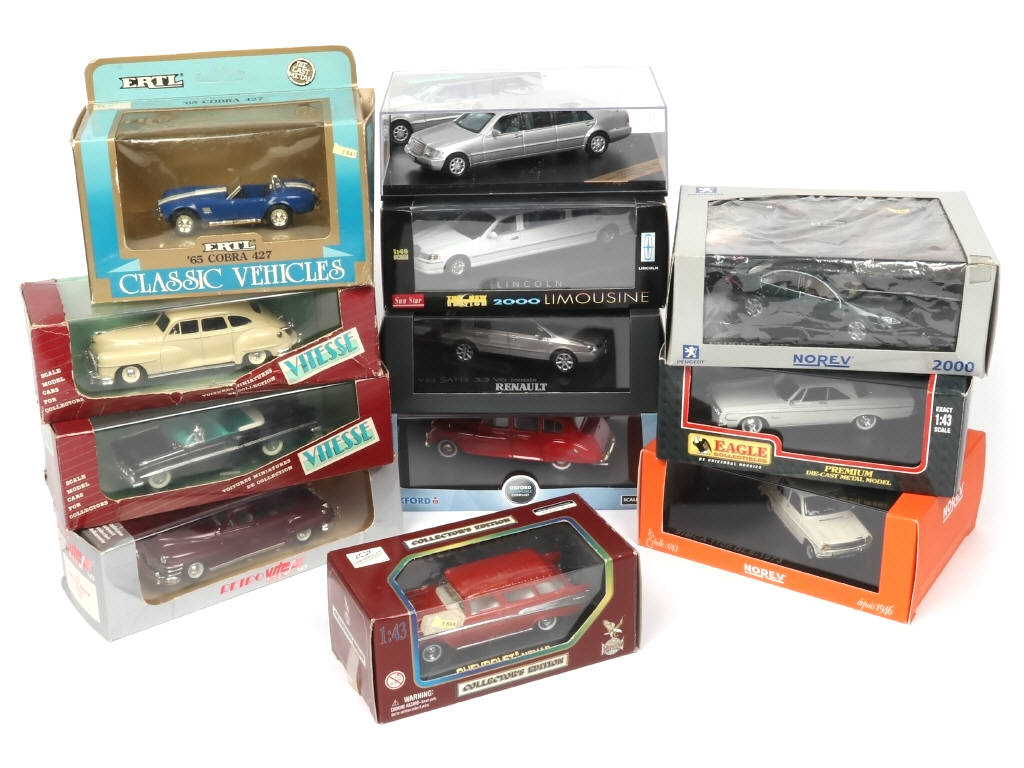 miniatures reproduisant notamment les modèles : SIMCA, COBRA, MERCEDES (sans suremballage, un rétroviseur cassé & recollé) & LINCOLN - on y retrouve notamment les marques : NOREV, VITESSE, ROAD LEGENDS & ERTL - les boîtes sont en états 'b' & 'c'